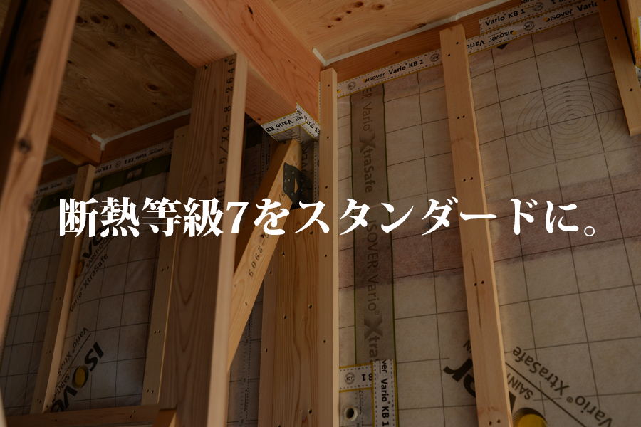 ・断熱等級7・許容応力度計算による耐震等級3・屋根断熱330mm(高性能GW)イゾベールコンフォート、壁断熱210mm(高性能GWイゾベールコンフォート)、基礎断熱100mm(スタイロフォームAT)・調湿気密シート(イゾベールバリオ)・透湿防水シート(ウートップハイムシールド)・窓/樹脂製トリプルガラス窓(ユニルクス)