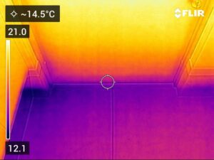 ご覧のようにサーモカメラはとても正直です。窓周りの画像ですが、窓部分と壁部分の温度差はそれほどありません。又、壁と床の接点や窓枠の下部は一般的に弱点となりやすいので、この画像の中では一番温度が低くなっています。それでも20℃ぐらいなので、かなり優秀であるとは思います。