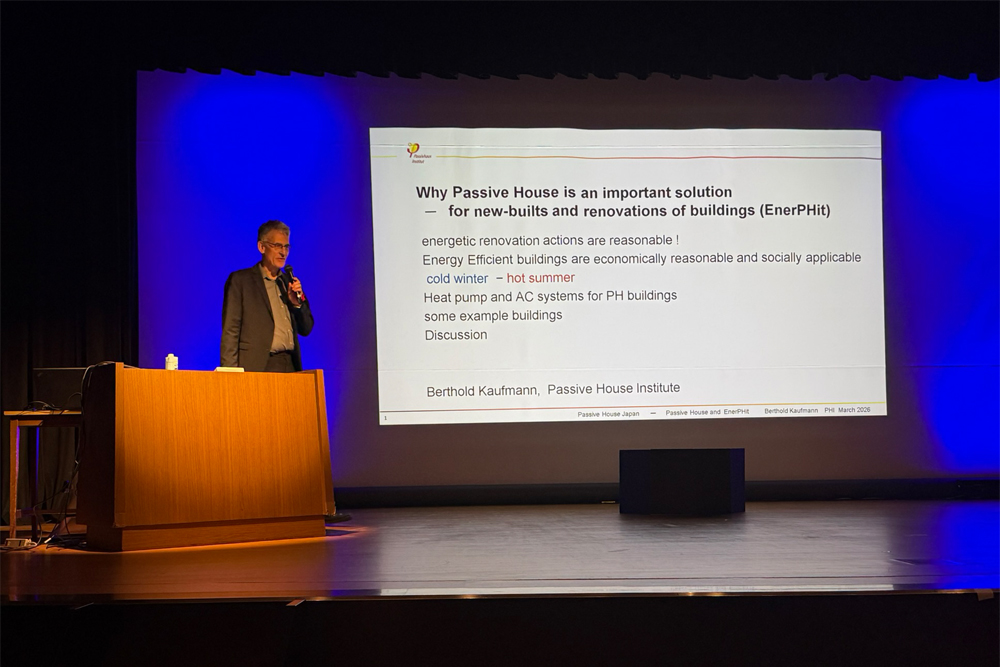 そして二人目はドイツのパッシブハウス研究所でアジアの物件を担当されるベアトホルト カウフマンさんです。実はこちらのカウフマンさんとはお会いしたことがありまして、以前、私がドイツのパッシブハウス研究所へレクチャーを受けに行った際に、ご自宅のパッシブハウスを見学させて頂き、その場でディテールについて詳しく説明してくださいました。当然なのかもしれませんが、パッシブハウスのディテールについては非常に詳しくて、壁や天井の断熱構成について、窓について、そして換気システムについてと理解度が高まった思い出があります。